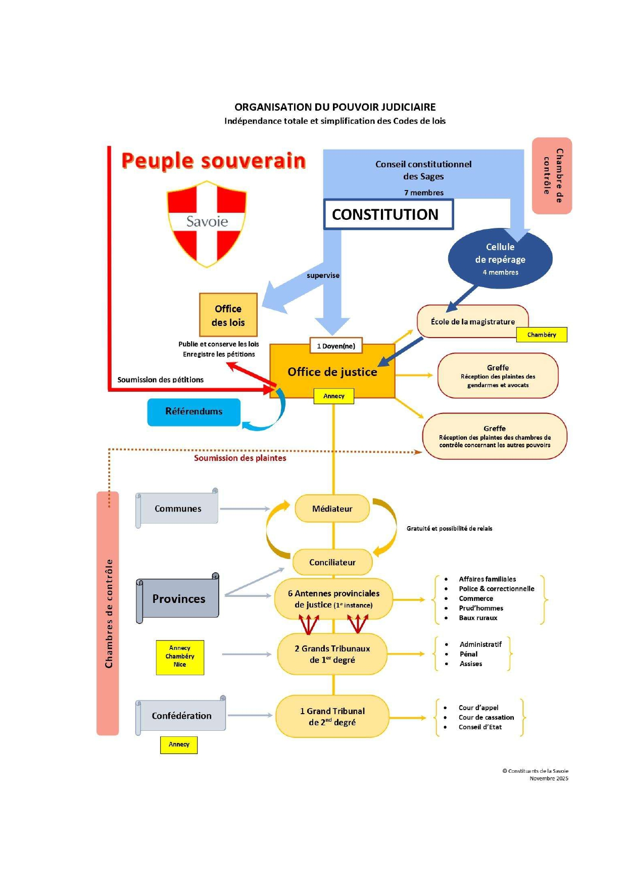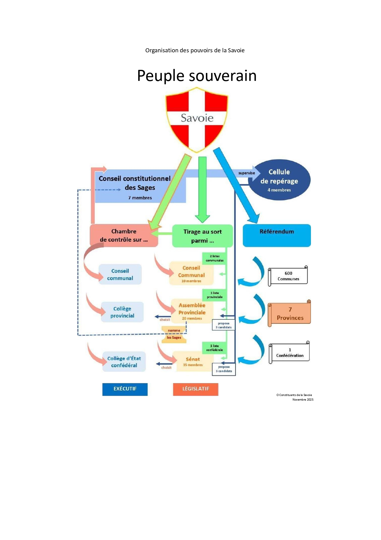 Note : Le schéma détaillé d'organisation des pouvoirs a été développé par les Constituants de la Savoie (novembre 2025) et constitue une base de réflexion pour l'avenir institutionnel du territoire.